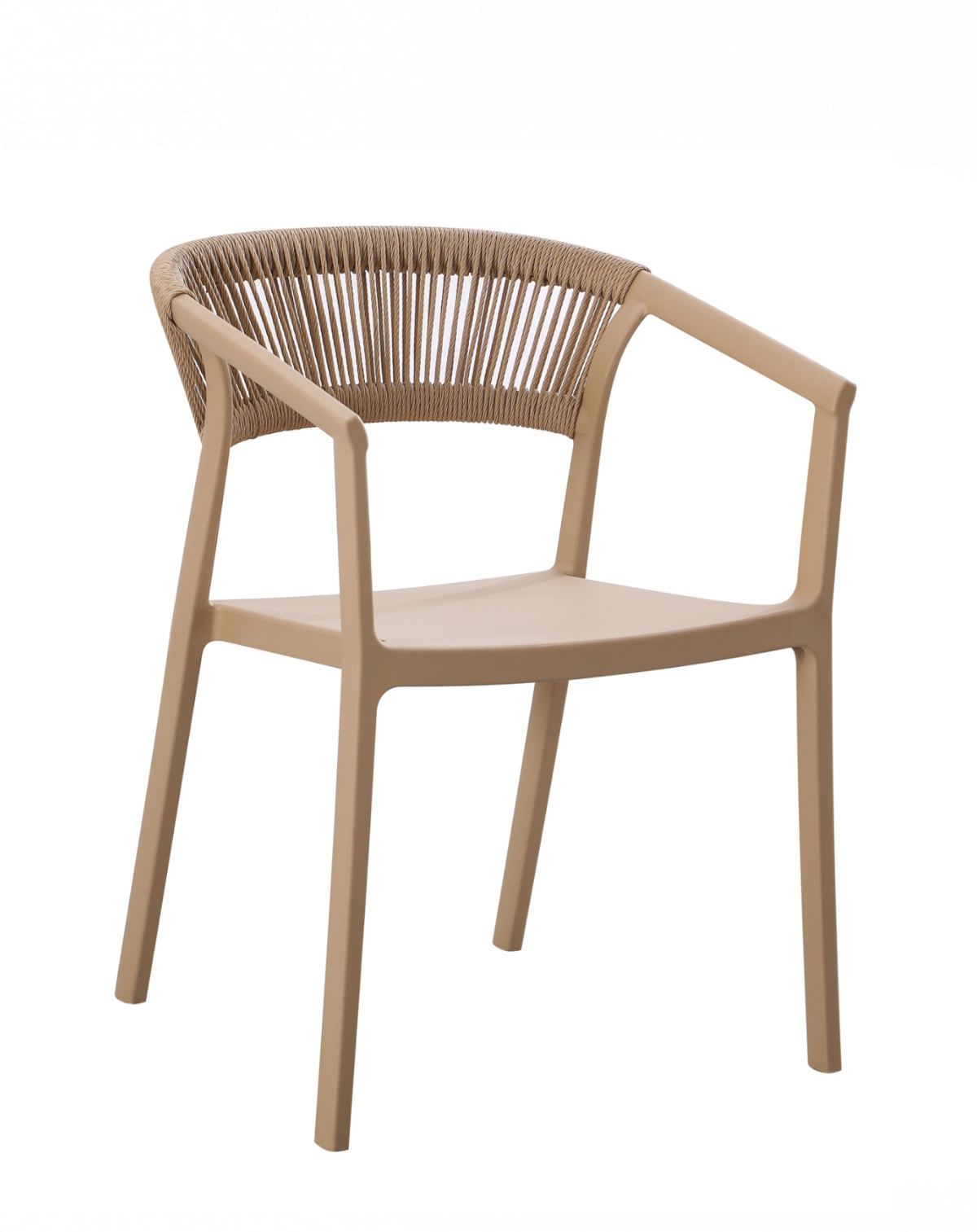 Είναι κατασκευασμένη από μονοκόμματο ενισχυμένο πολυπροπυλένιο σε cappuccino χρώμα, προσφέροντας υψηλή αντοχή σε βάρος, υγρασία και έντονη χρήση. Η ελαφρώς κυρτή πλάτη είναι επενδυμένη με συνθετικό σχοινί πολυπροπυλενίου σε μπεζ απόχρωση, προσδίδοντας φυσική αισθητική και μοντέρνο χαρακτήρα. Τα ενσωματωμένα μπράτσα ενισχύουν την εργονομία και την άνεση.