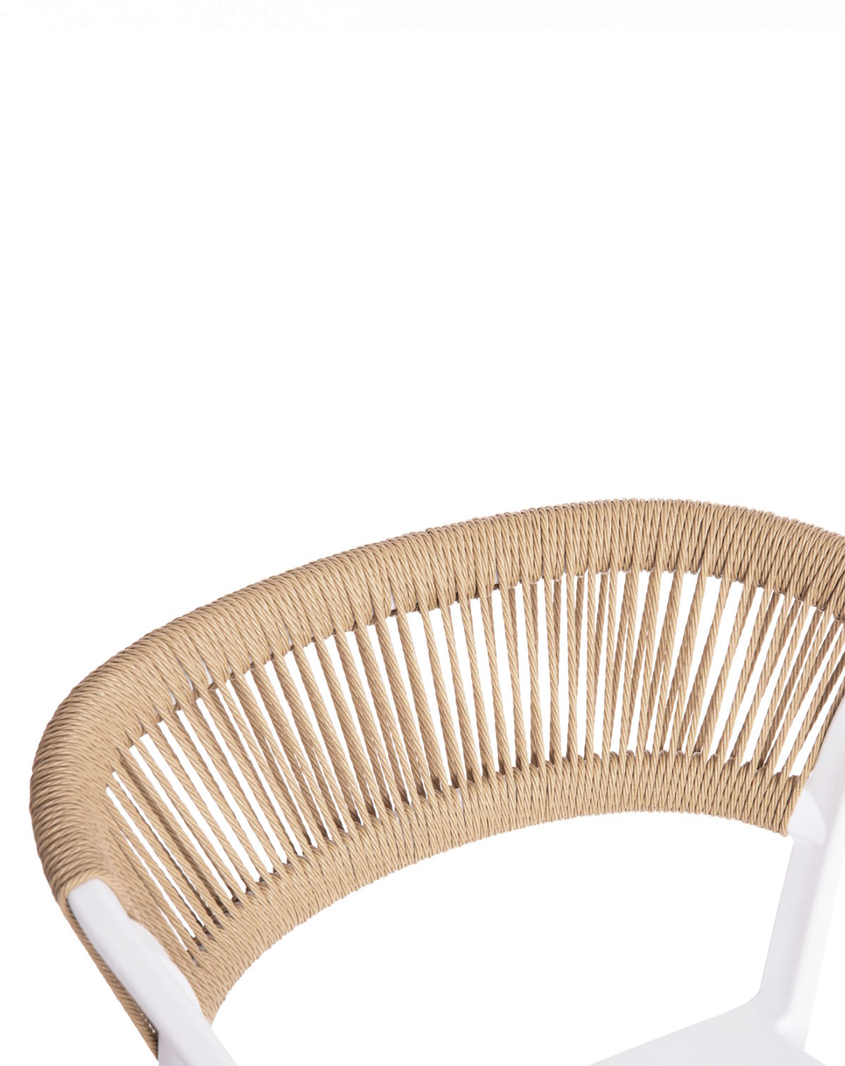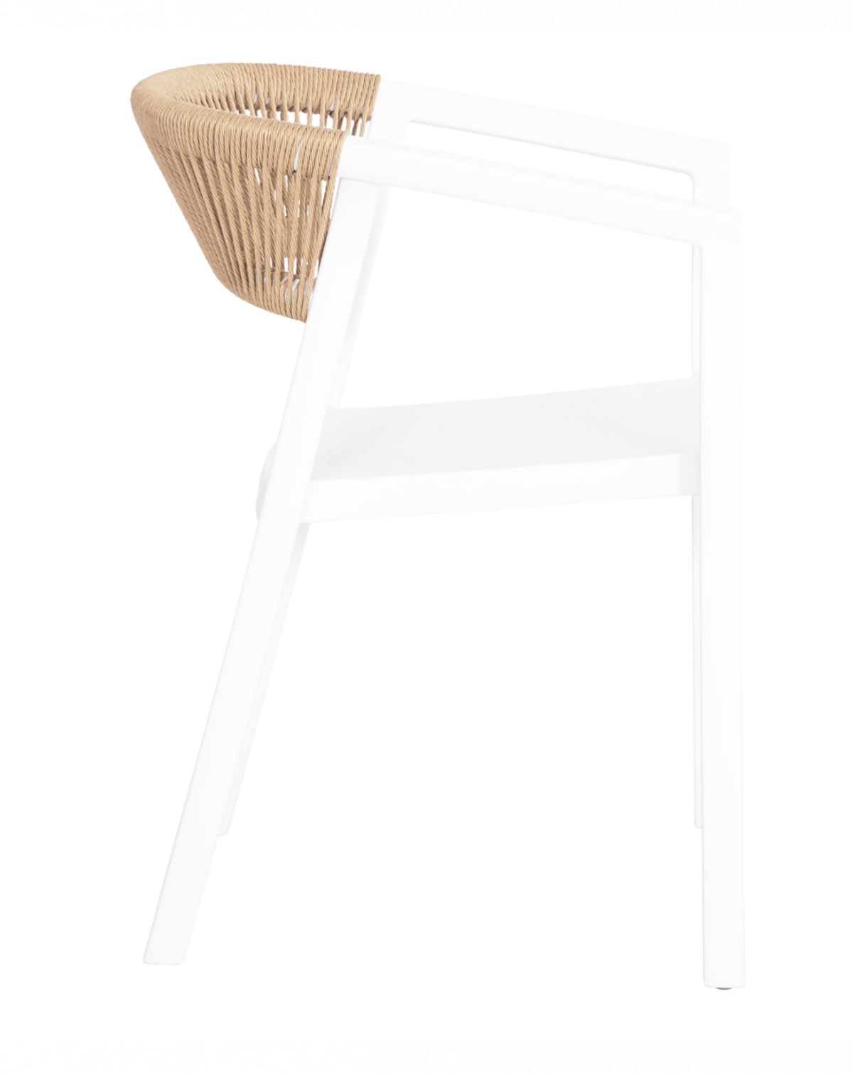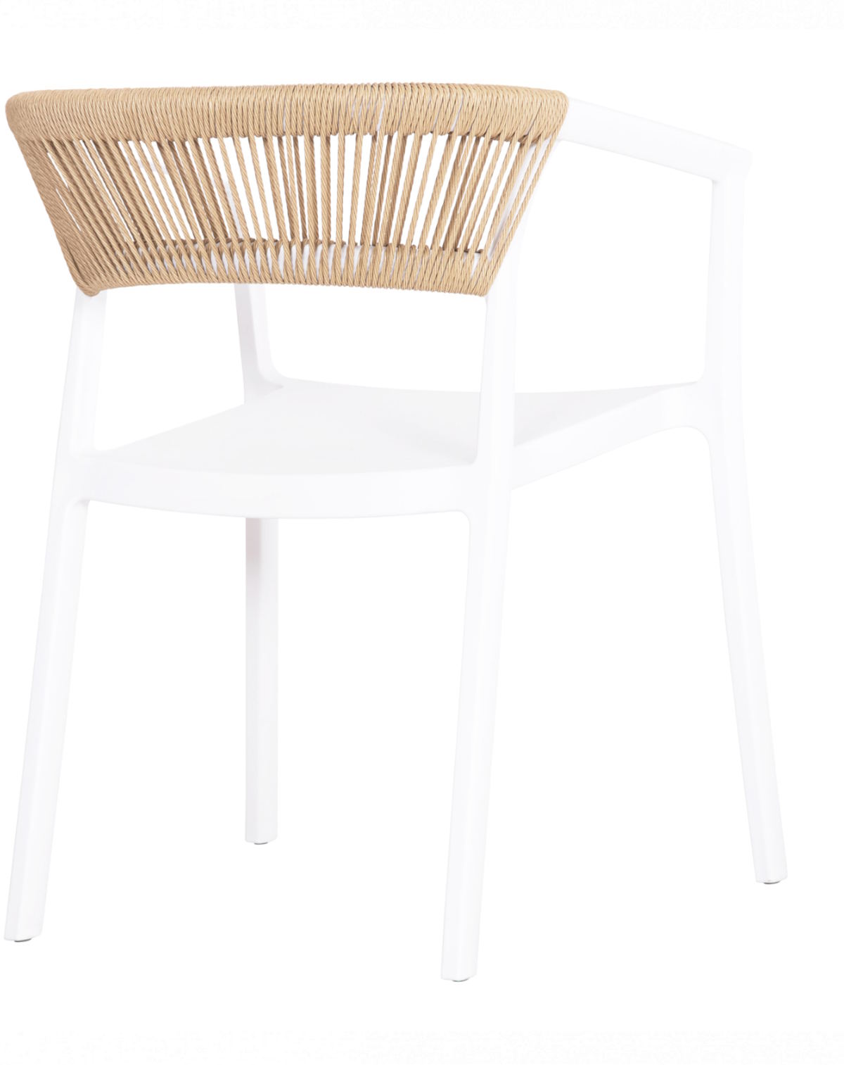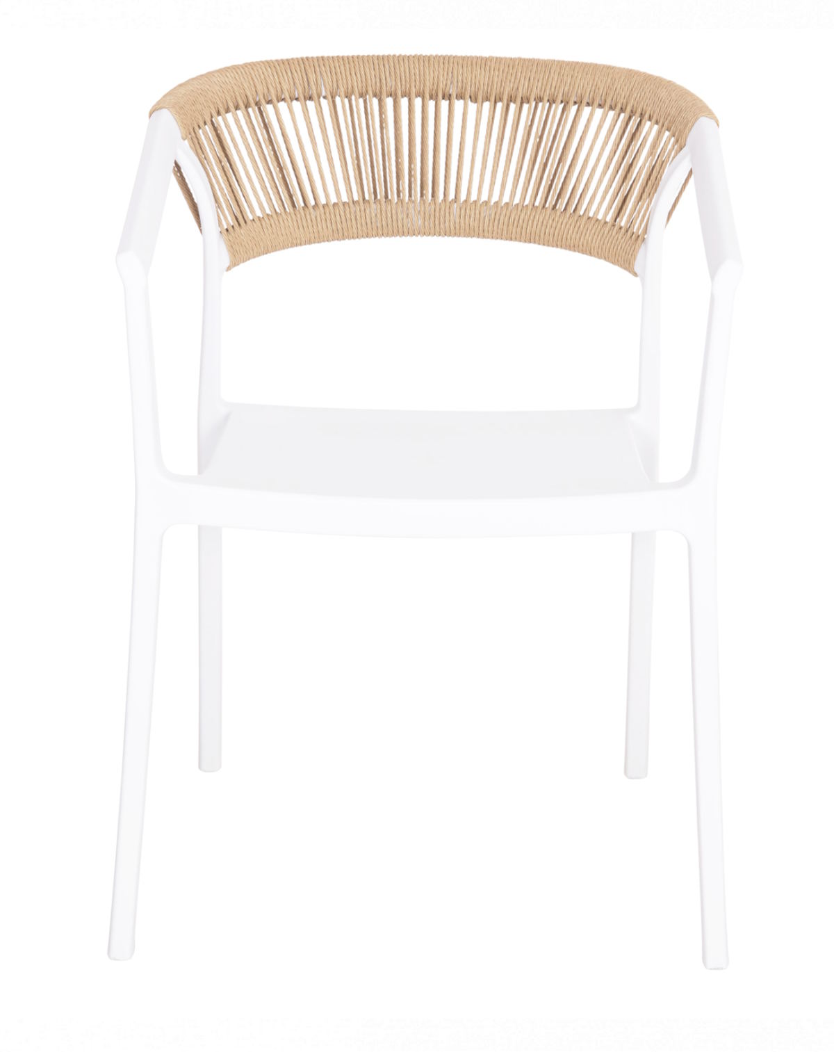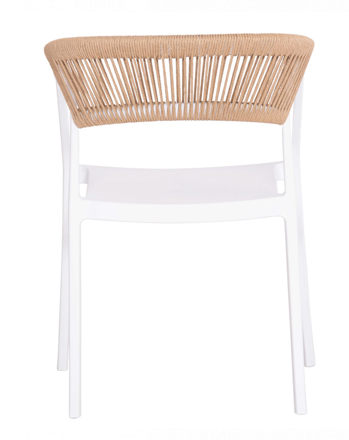 Είναι κατασκευασμένη από μονοκόμματο ενισχυμένο πολυπροπυλένιο σε λευκό χρώμα, προσφέροντας υψηλή αντοχή σε βάρος, υγρασία και έντονη χρήση. Η ελαφρώς κυρτή πλάτη είναι επενδυμένη με συνθετικό σχοινί πολυπροπυλενίου σε μπεζ απόχρωση, προσδίδοντας φυσική αισθητική και μοντέρνο χαρακτήρα. Τα ενσωματωμένα μπράτσα ενισχύουν την εργονομία και την άνεση.