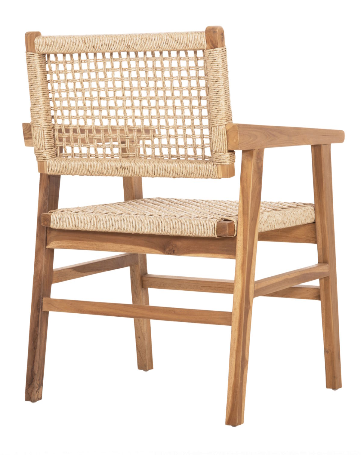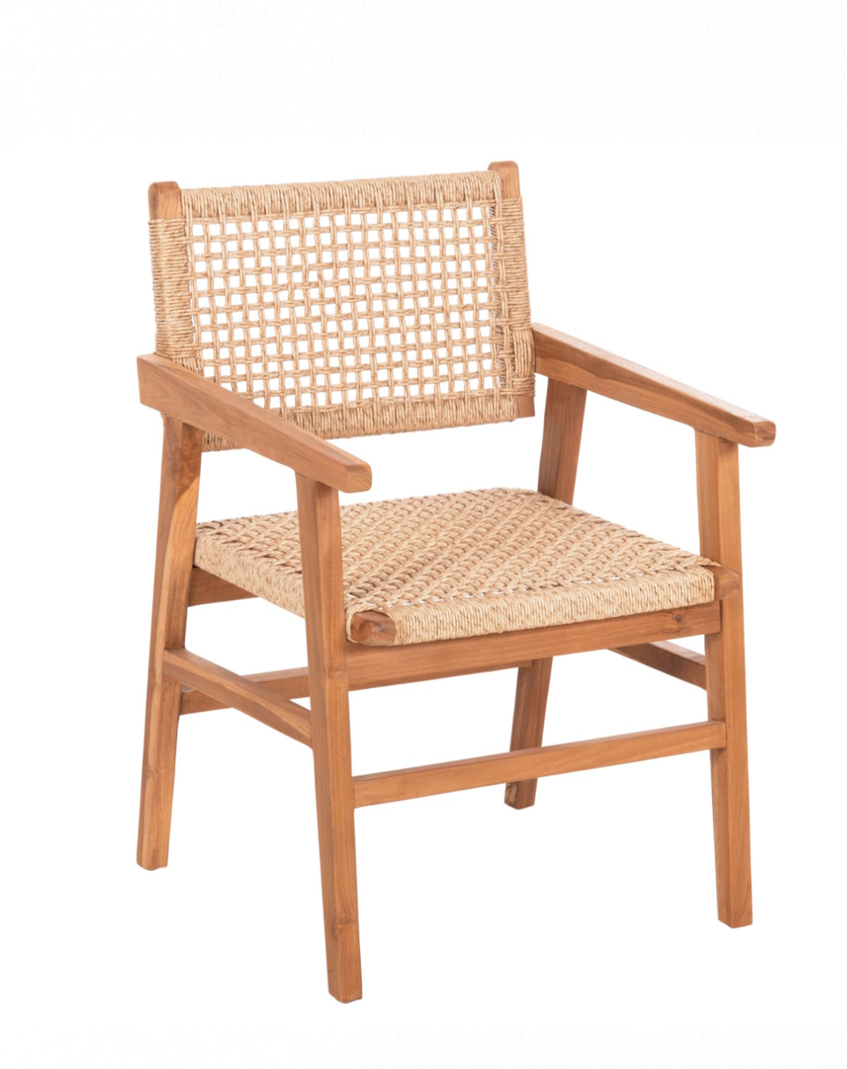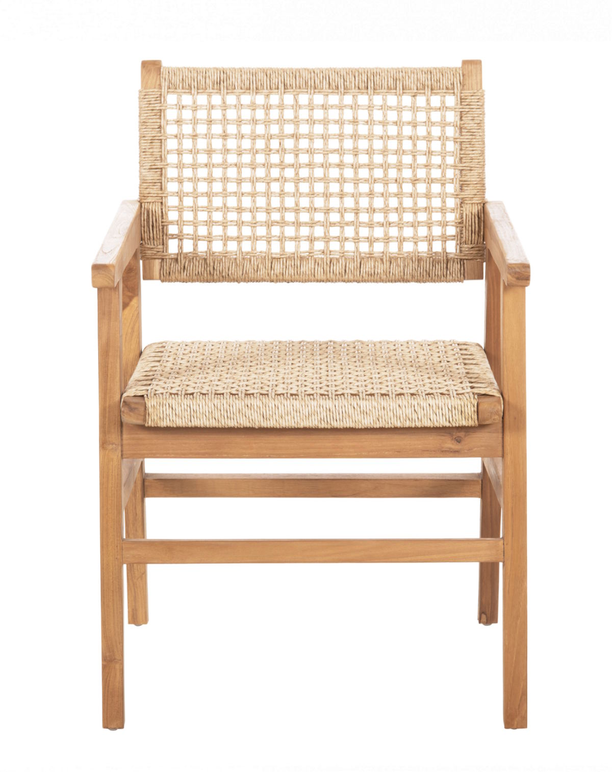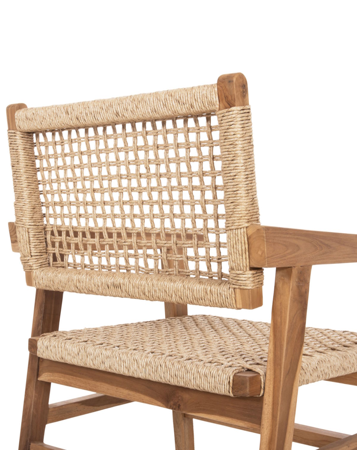 Ο σκελετός είναι κατασκευασμένος από μασίφ ξύλο ΤΕΑΚ σε φυσική απόχρωση, προσφέροντας υψηλή αντοχή και σταθερότητα. Το φαρδύ κάθισμα και η μεσαίου ύψους πλάτη διαθέτουν αριστοτεχνικά πλεγμένο σχοινί άριστης ποιότητας, εξασφαλίζοντας άνεση και ανθεκτικότητα σε απαιτητικές συνθήκες επαγγελματικής χρήσης.