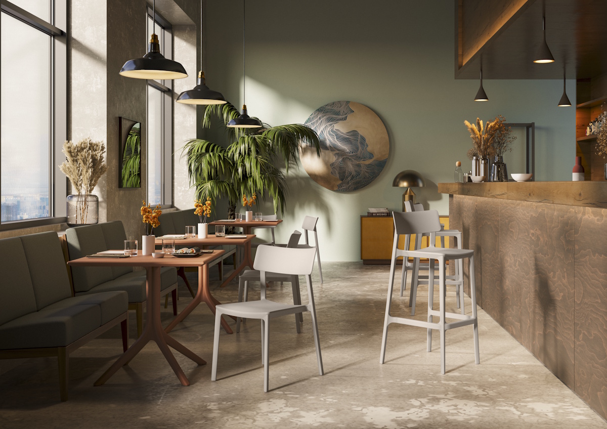 Μια στοιβαζόμενη monoblock καρέκλα πολυπροπυλενίου. Κατασκευάζεται στην Ιταλία. Σχεδιασμός: SANDONA' - BETTINI.