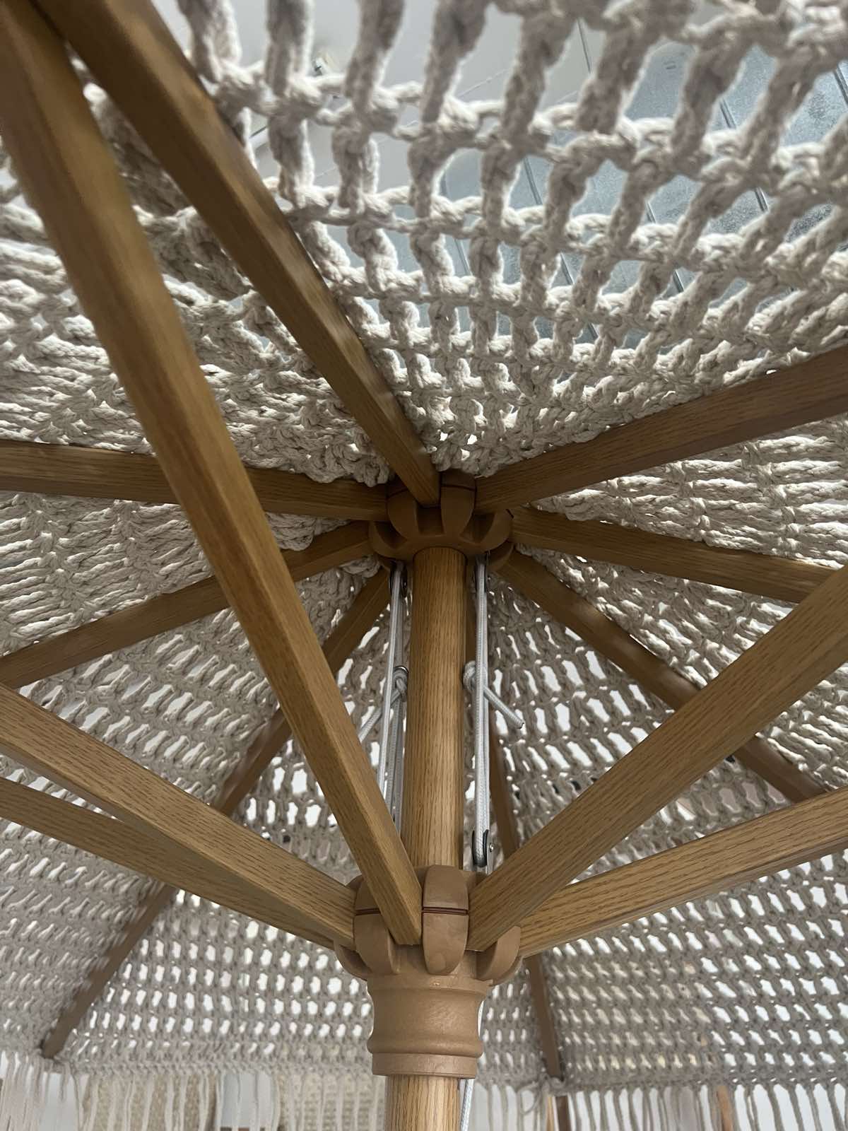 Round umbrella Φ250 cm with an aluminum frame in teak wood color. With 8-spokes (20x30 mm) and a canopy made of woven acrylic sailing rope in beige color, with a double pulley opening system.