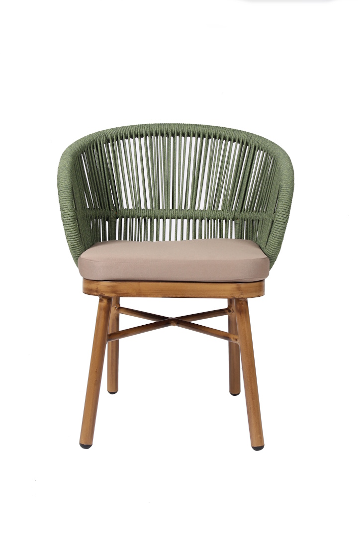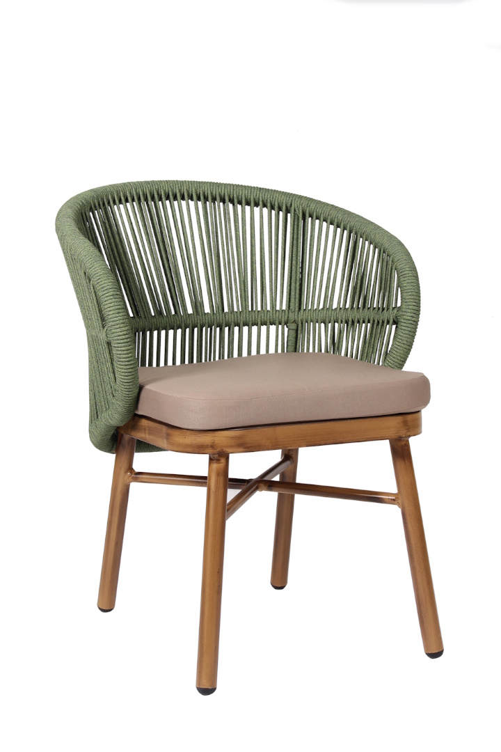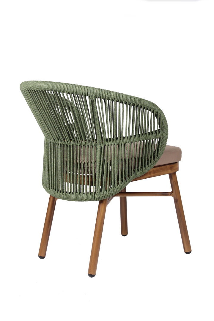 Πολυθρόνα αλουμινίου στοιβαζόμενη με βαφή σκελετού σε χρώμα ξύλου, πλεγμένη με ναυτικό σχοινί διαμέτρου 6mm πράσινου χρώματος. Μαξιλάρι 4cm με outdoor ύφασμα σε καφέ χρώμα.