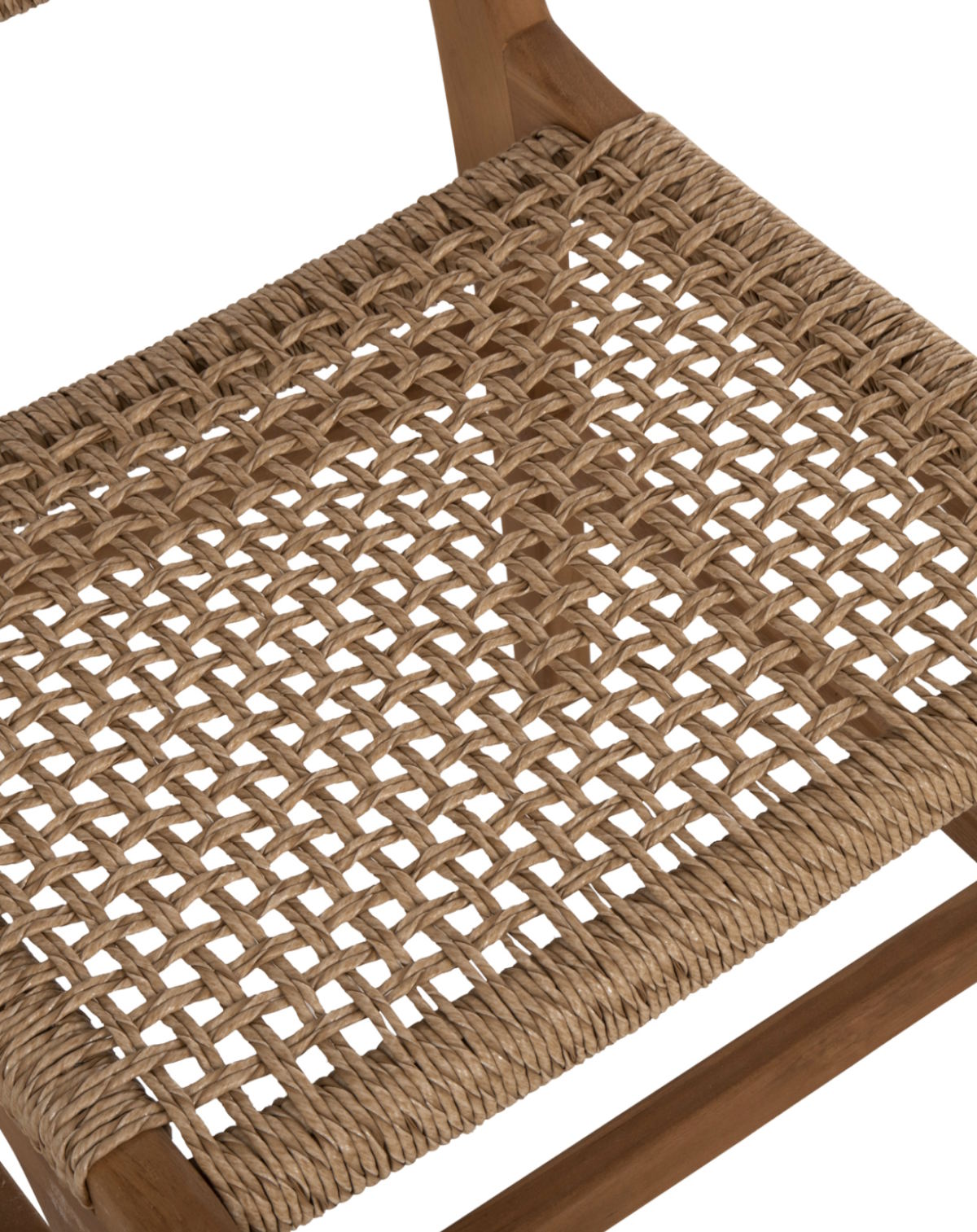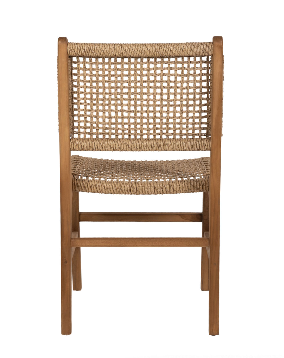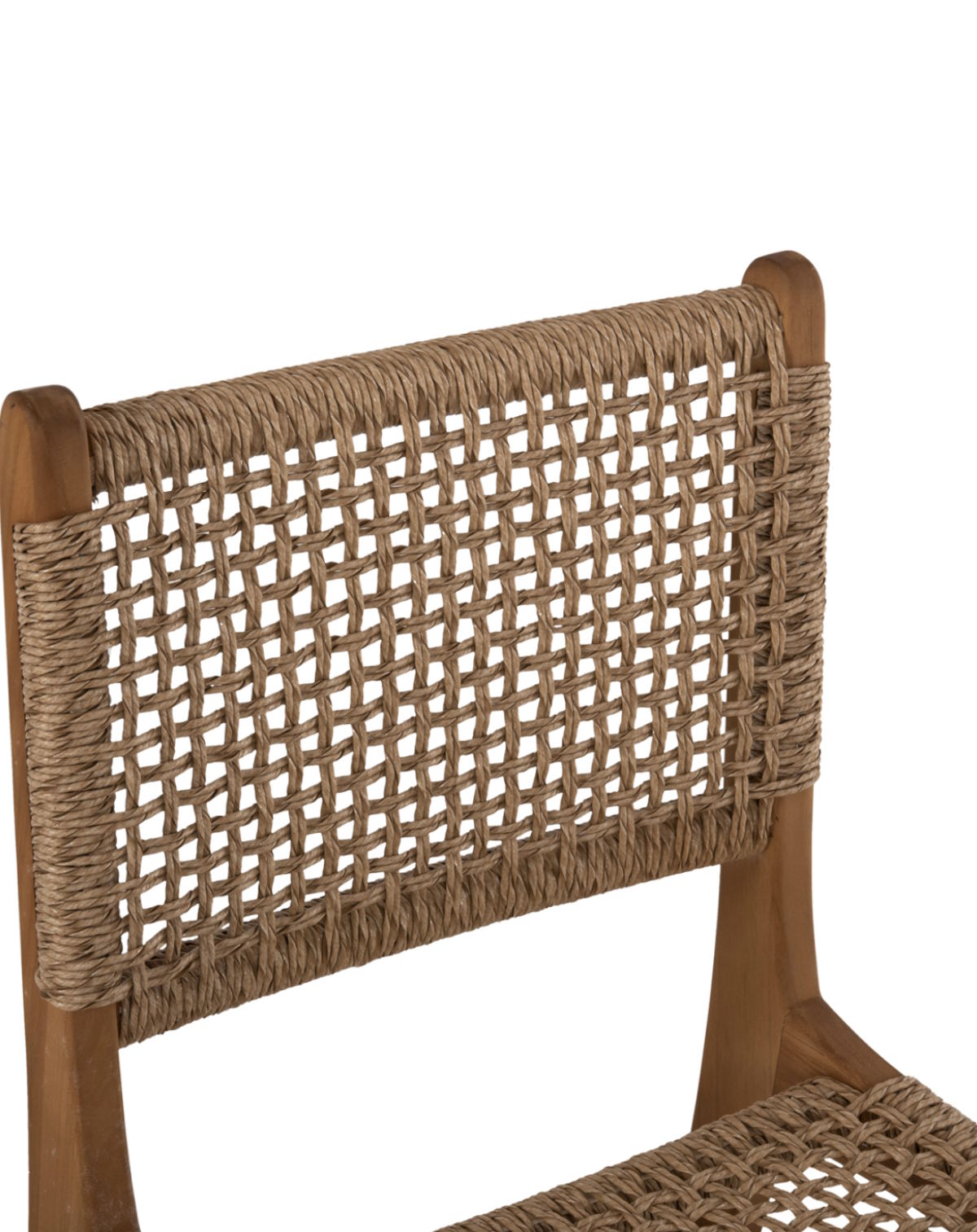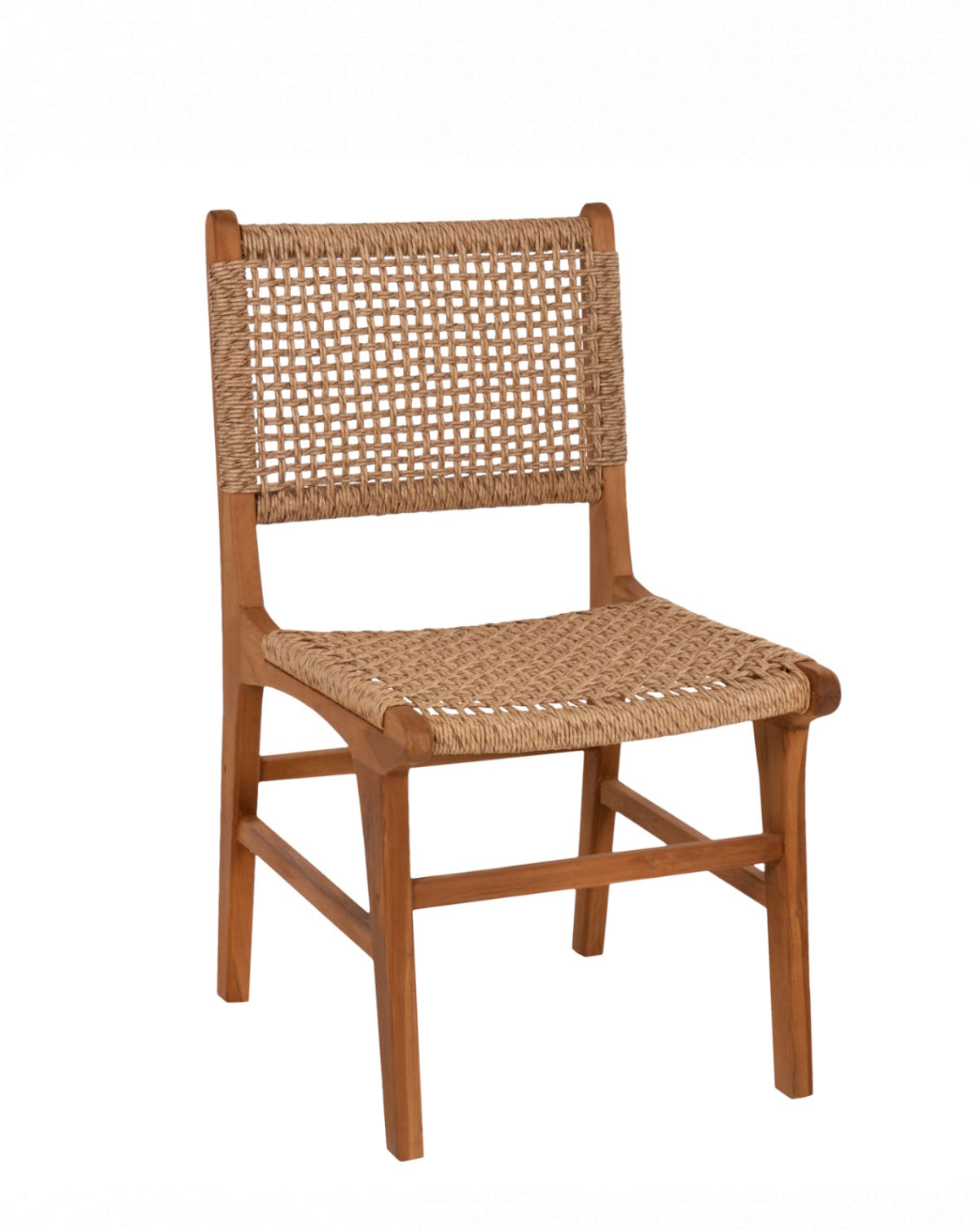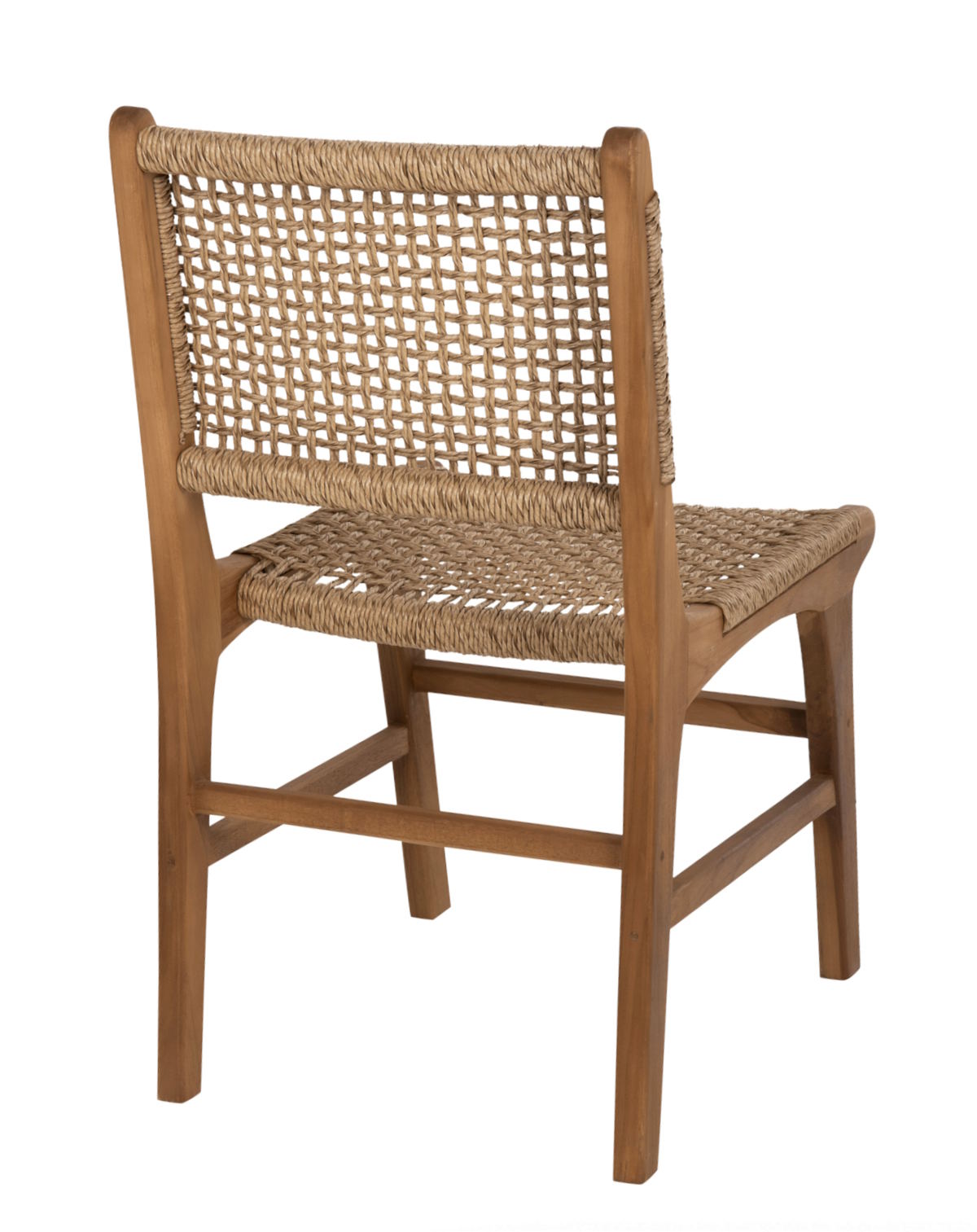 Ο σκελετός της καρέκλας είναι κατασκευασμένος από μασίφ ξύλο ΤΕΑΚ σε φυσική απόχρωση, προσφέροντας υψηλή μηχανική αντοχή και σταθερότητα. Το φαρδύ κάθισμα και η μεσαίου ύψους πλάτη διαθέτουν αριστοτεχνικά πλεγμένο συνθετικό σχοινί VIRO (HDPE), εξασφαλίζοντας άνεση, ανθεκτικότητα και σταθερό χρώμα ακόμα και σε έντονη ηλιοφάνεια.