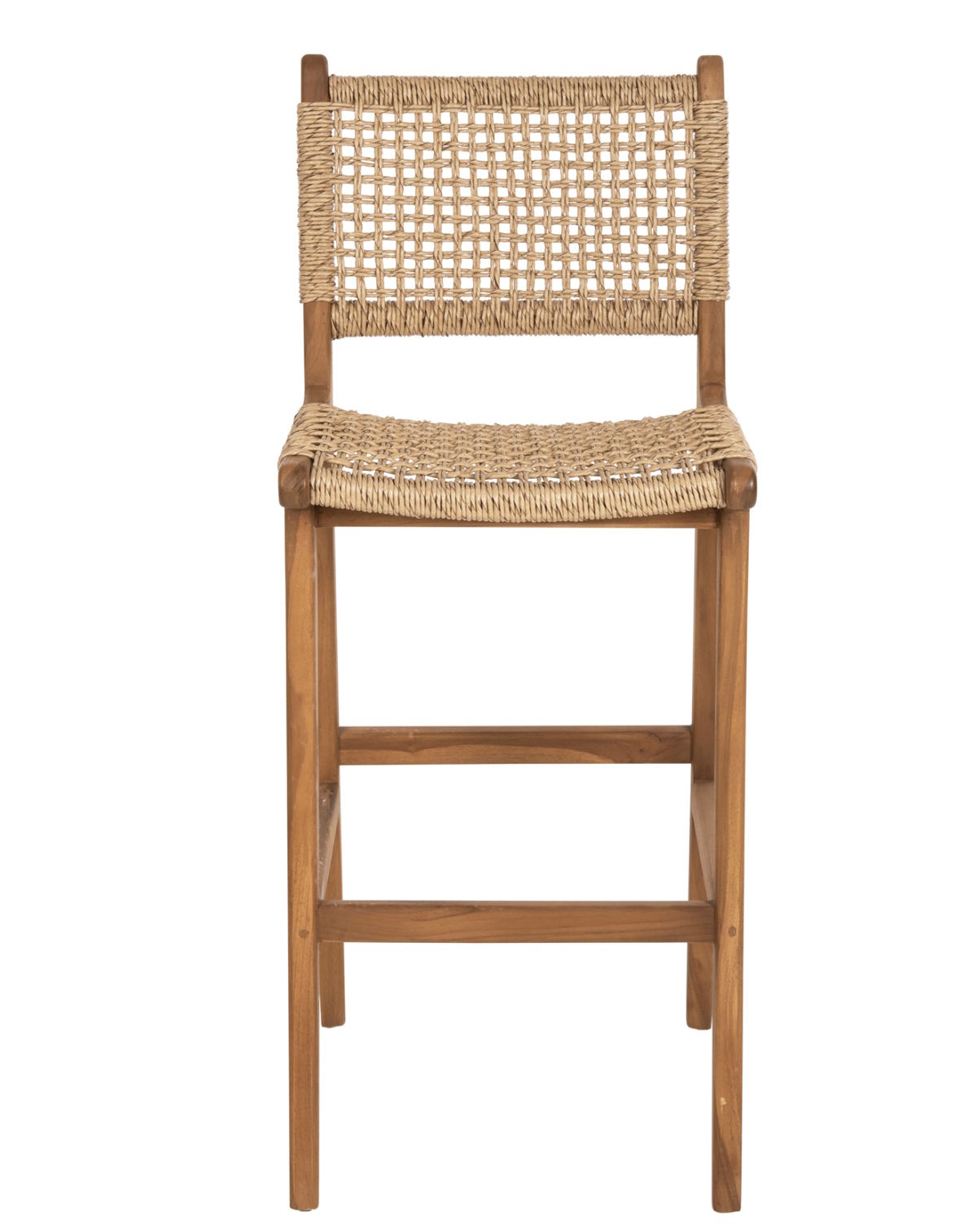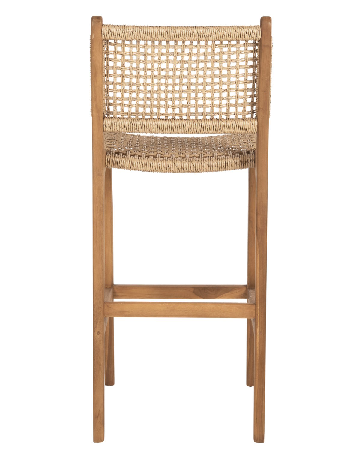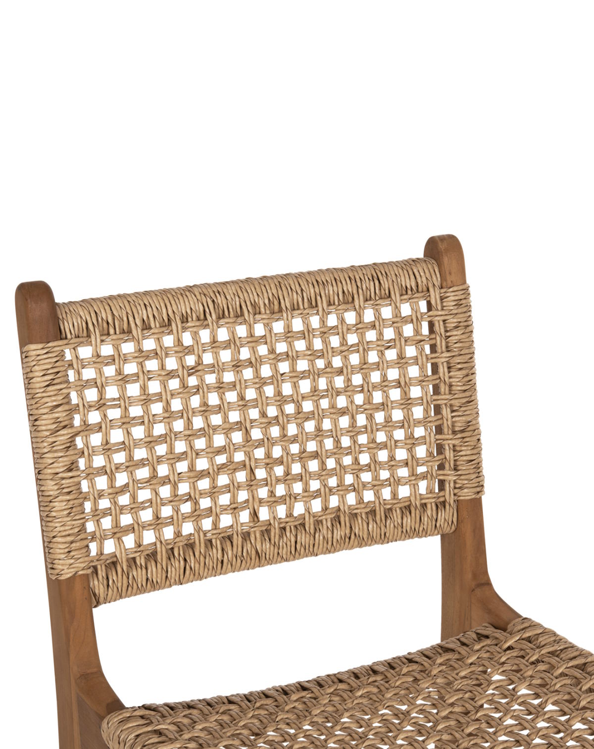 Ο σκελετός είναι κατασκευασμένος από μασίφ ξύλο ΤΕΑΚ σε φυσική απόχρωση, προσφέροντας εξαιρετική σταθερότητα και ανθεκτικότητα στη χρήση. Το κάθισμα και η κοντή πλάτη διαθέτουν τετραγωνισμένη πλέξη σχοινιού σε μπεζ χρώμα, δημιουργώντας ένα κομψό και φιλόξενο αποτέλεσμα που ταιριάζει σε minimal, boho ή contemporary επαγγελματικά περιβάλλοντα.