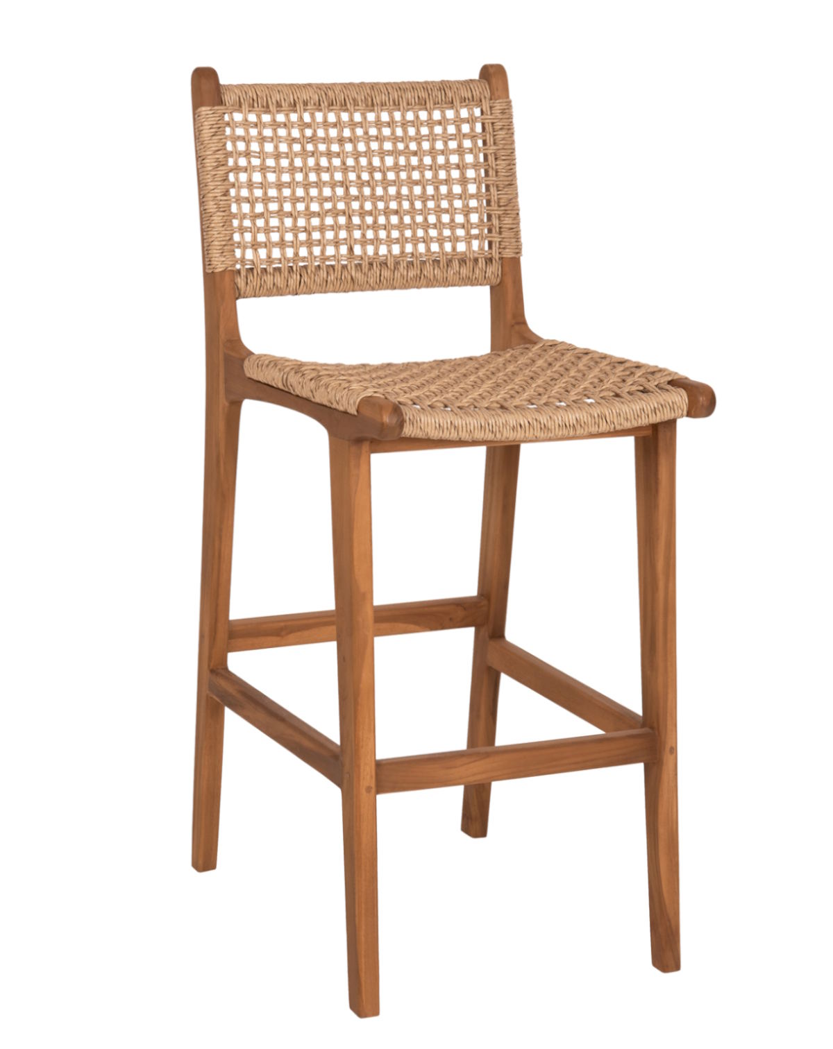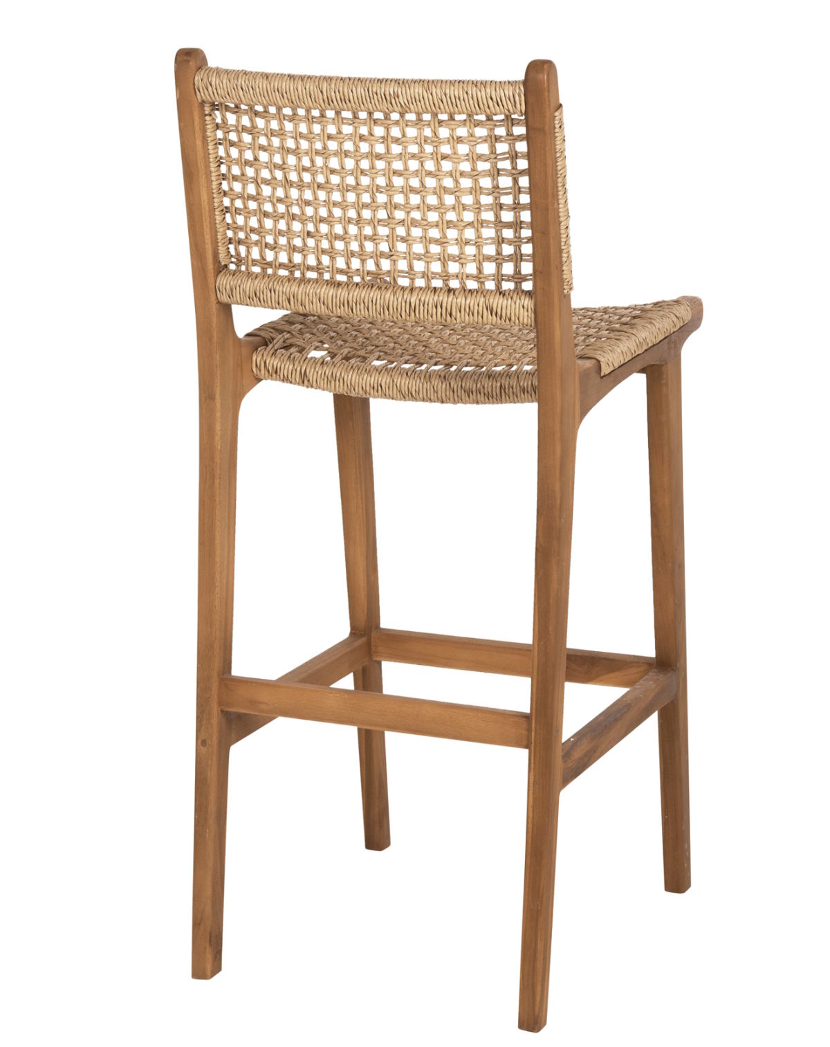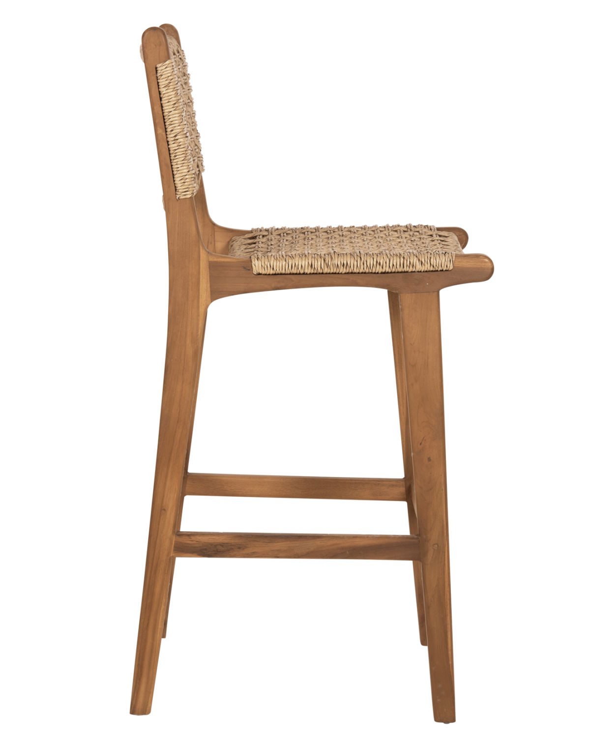 Ο σκελετός είναι κατασκευασμένος από μασίφ ξύλο ΤΕΑΚ σε φυσική απόχρωση, προσφέροντας εξαιρετική σταθερότητα και ανθεκτικότητα στη χρήση. Το κάθισμα και η κοντή πλάτη διαθέτουν τετραγωνισμένη πλέξη σχοινιού σε μπεζ χρώμα, δημιουργώντας ένα κομψό και φιλόξενο αποτέλεσμα που ταιριάζει σε minimal, boho ή contemporary επαγγελματικά περιβάλλοντα.
