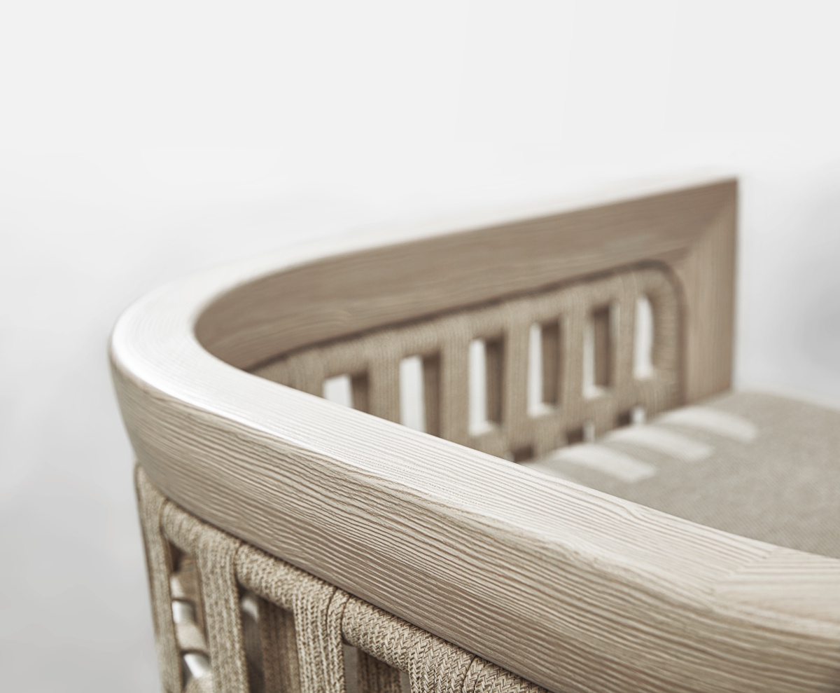 Σε ένα παιχνίδι στερεών και κενών, φώτων και σκιών, γεννιέται η συλλογή RIVA. Είναι εμπνευσμένη από το μαυριτανικό στυλ της ανδαλουσιανής αρχιτεκτονικής και χαρακτηρίζεται από τις αυστηρές και ουσιαστικές γραμμές της. Οι άδειοι χώροι, που δημιουργούνται από την ιδιαίτερη κατασκευή του νήματος, θυμίζουν τις καμάρες του Παλατιού του Καρόλου Ε' στη Γρανάδα. Μια πινελιά Ισπανίας στο σπίτι σας. Ένα lounge set 5-τεμαχίων αποτελούμενο από: 2 πολυθρόνες lounge διαστάσεων 78x74x60cm, 1 καναπές lounge 3-θέσιος διαστάσεων 214x74x60cm, 1 κεντρικό τραπεζάκι καφέ διαστάσεων 120x70x40cm και 1 βοηθητικό τραπεζάκι διαστάσεων 50x50x45cm. Ο σκελετός είναι κατασκευασμένος από αλουμίνιο με 3D εκτύπωση, πλεγμένος με σχοινί. Μπεζ μαξιλάρια με outdoor ύφασμα. Σχεδιασμένο από τον Claudio Bellini.