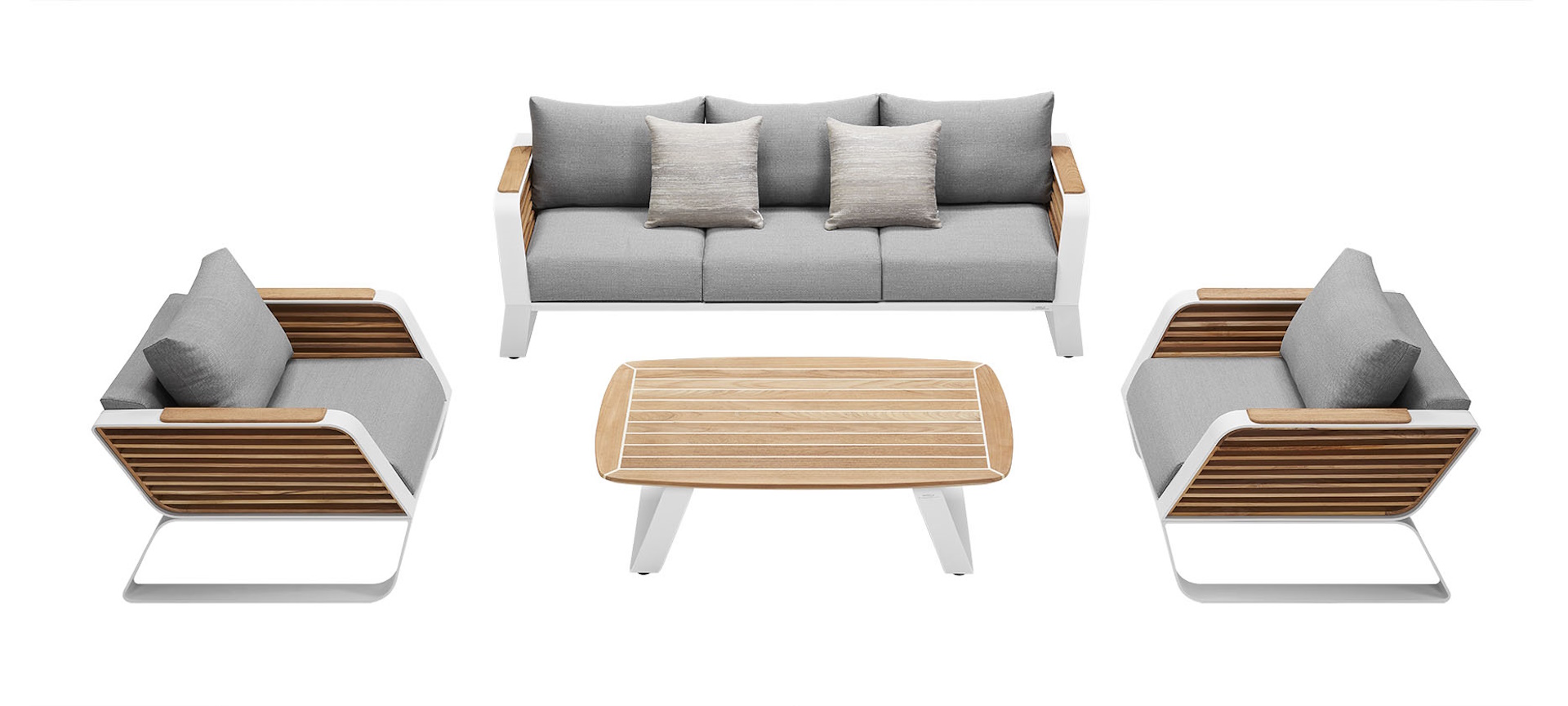 Εμπνευσμένο από την ελαφρότητα του φτερού, το κατεξοχήν αρχέτυπο που συνδυάζει ελαφρότητα και δύναμη στη συλλογή WING, οι σχεδιαστές καθοδηγήθηκαν από την έννοια της φυσικής και αντιληπτής ελαφρότητας. Οι δυναμικές, αγνές και κομψές γραμμές δίνουν στιλ στη συλλογή. Kατάλληλο τόσο για αστικoύς χώρους όσο και για χώρους όπου η φύση είναι η πρωταγωνίστρια. Τα στοιχεία της συλλογής χαρακτηρίζονται από διπλωμένη δομή αλουμινίου, εμπλουτισμένα από γεωμετρικές και ουσιαστικές γραμμές που θυμίζουν τον κόσμο της αρχιτεκτονικής. Σχεδιασμένο από τον PININFARINA. Το Wing-3 lounge set αλουμινίου 4-τεμαχίων αποτελείται από: 2 πολυθρόνες lounge διαστάσεων 89x85,5x60,5cm , 1 καναπέ lounge 3-θέσιο διαστάσεων 203,5x85,5x60,5cm και 1 κεντρικό τραπεζάκι καφέ διαστάσεων 120x80x39,5cm. Μαξιλάρια: Grey no. FA-4167. Διακοσμητικά Μαξιλάρια: Grey. Χρώμα σκελετού αλουμινίου: Λευκό no. 0164. Όλα τα ξύλινα μέρη είναι teak.
